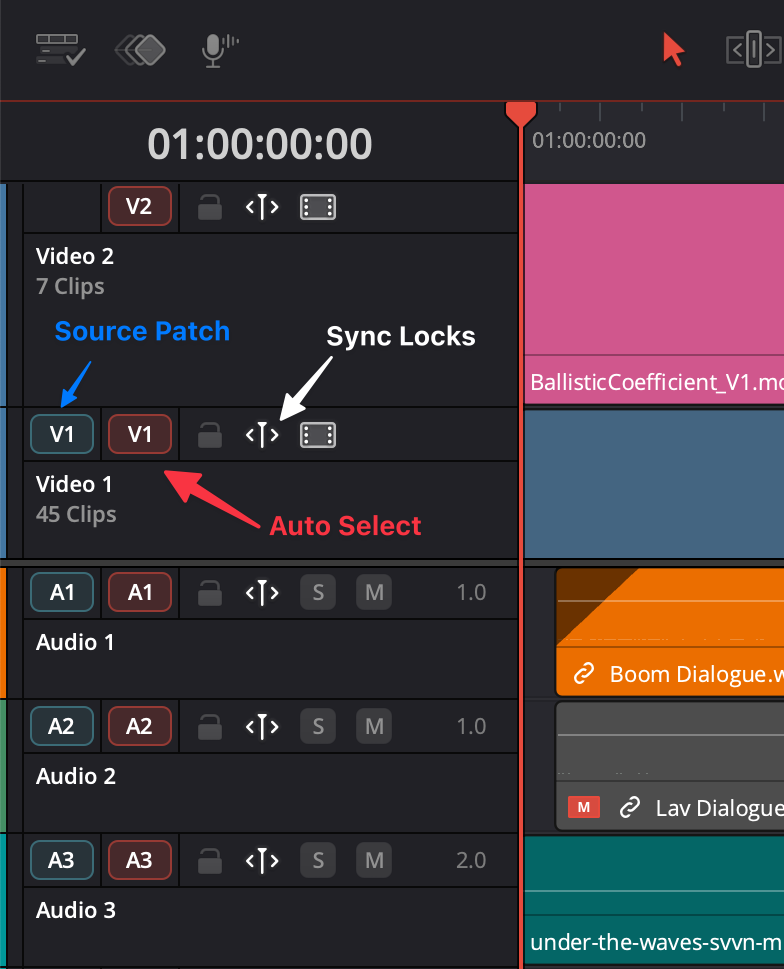 The new Auto Select button is now a dedicated red column. It's important to know this no longer controls ripple trimming; that's what Sync Locks are for. Instead, Auto Select tells Resolve which tracks to "pay attention to" for various actions. For example, if you want to add a cut across every track except your music, you can disable the Auto Select for the music track before hitting Command/Control + B. It also governs selections for copying and pasting, using keyboard shortcuts to select edit points (V) or clips (Shift+V), and match-framing.