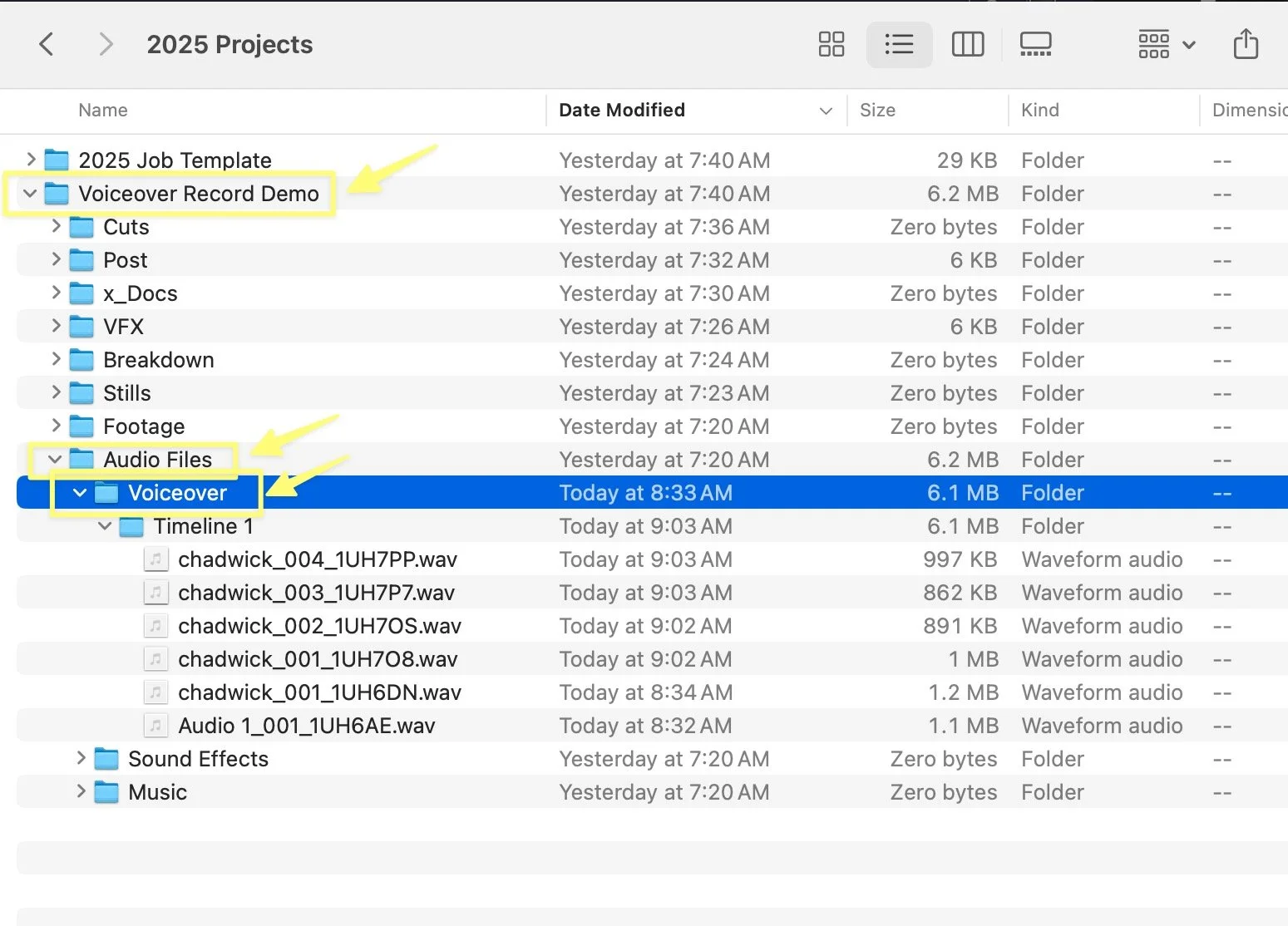 Inside the location you choose (it can be local, external, or network storage), DaVinci Resolve will create a folder using the project name. Inside the project folder, a folder named "Audio Files" will be created, and within it, a folder named "Voiceover" will be created. The reason I mention this is that I have decided to build my latest job folder template around this, so that Resolve is not creating folders for me. Instead, I will always still have my audio files inside my job folders for easy archival and transport, but I’ve built this hierarchy into my elements folder template.